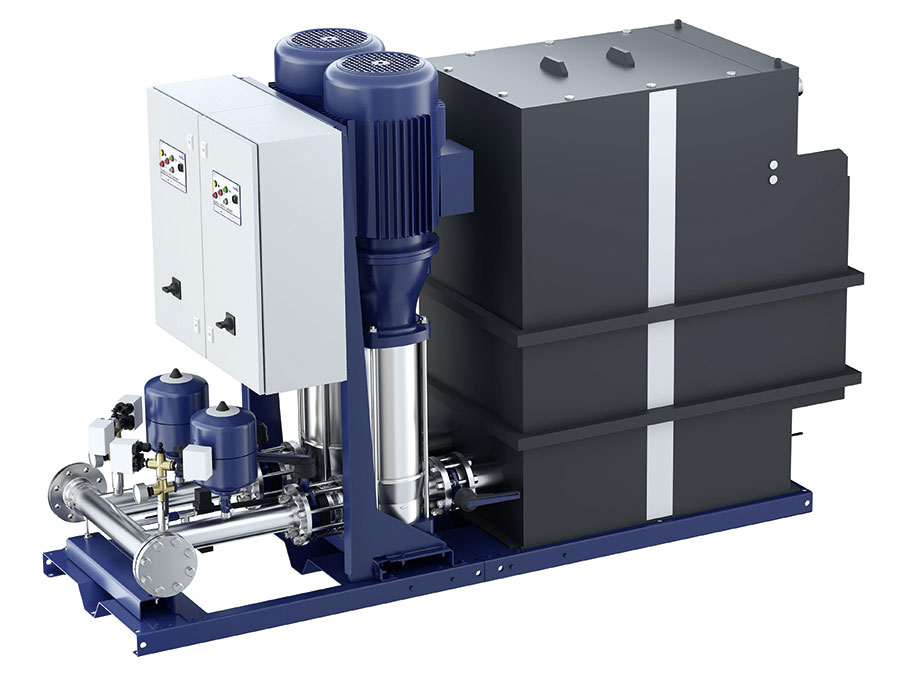 Besonders die Forderung nach Redundanz bei der Löschwasserverfügbarkeit bedingt, dass alle Stell-, Regel- sowie Messglieder jetzt doppelt oder redundant vorhanden sind. Ebenso verfügen beide Modelle über zwei Zulaufeinrichtungen, die für die hygienische Trennung von Trinkwasser und Feuerlöschwasser gemäß EN 1717 sorgen. Das Nutzvolumen des Durchflussbehälters beträgt jetzt 600 l, um eventuelle Schwankungen der Zulaufmengen auszugleichen und die Pumpen „auf jeden Fall“ für eine Minute mit Wasser zu versorgen. Neu gestaltete Ansaugkrümmer gestatten es, das Volumen des Behälters voll auszunutzen. Ein Fenster als optische Füllstandsanzeige gibt Aufschluss über den Wasserstand.