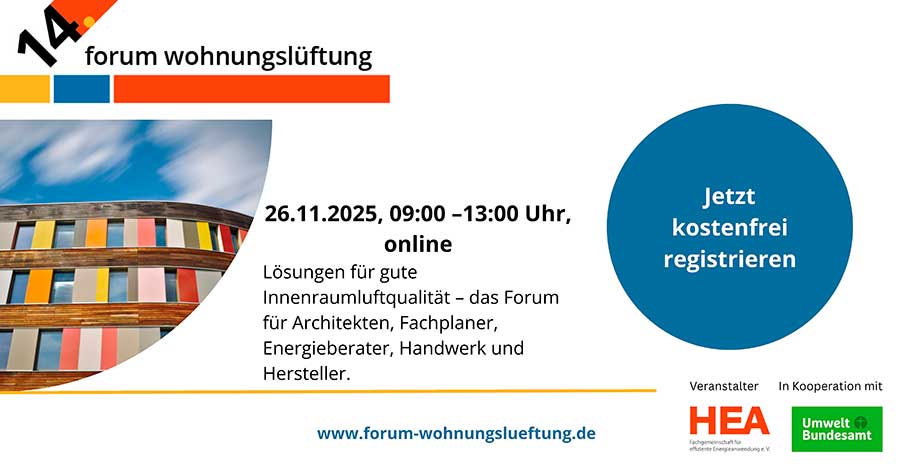 Das digitale Forum Wohnungslüftung findet am 26. November 2025 in der Zeit von 09:00 bis 13:00 Uhr statt. Weitere Informationen sowie die Möglichkeit der kostenfreien Anmeldung gibt es auf der Veranstaltungswebsite.