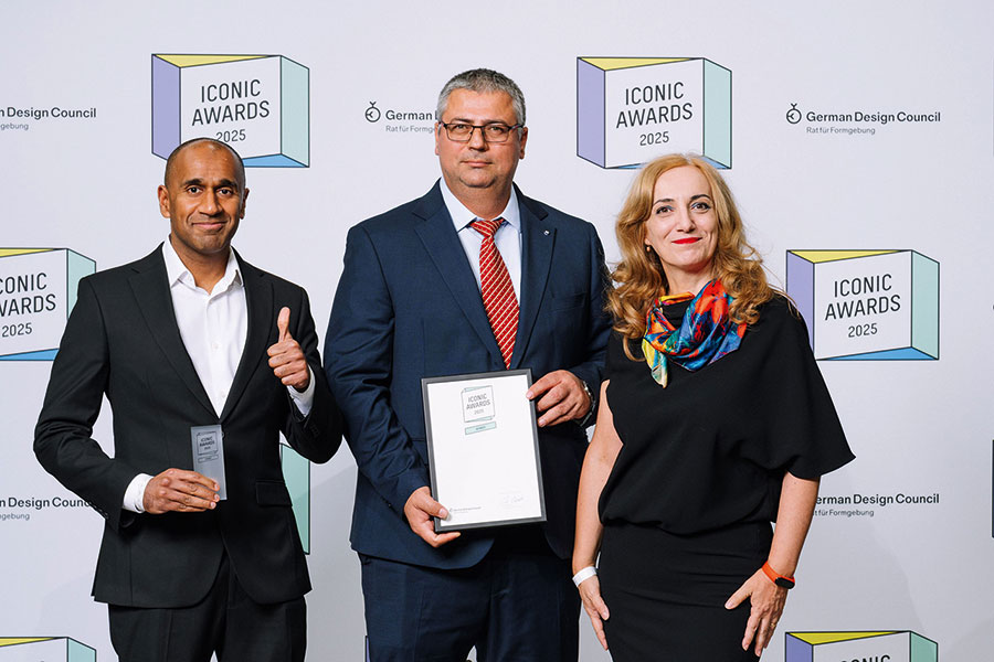 Freuen sich über den Iconic Award 2025 (v. l.): Produktmanager Basile Moudivendar, Werkleiter Costin Stanculete und Marketingmanagerin Codrina Mihaela Ichim von Armstrong Fluid Technology. Bild: Michaela Hartmann/Iconic Awards
