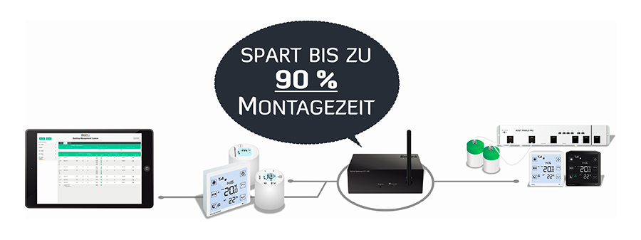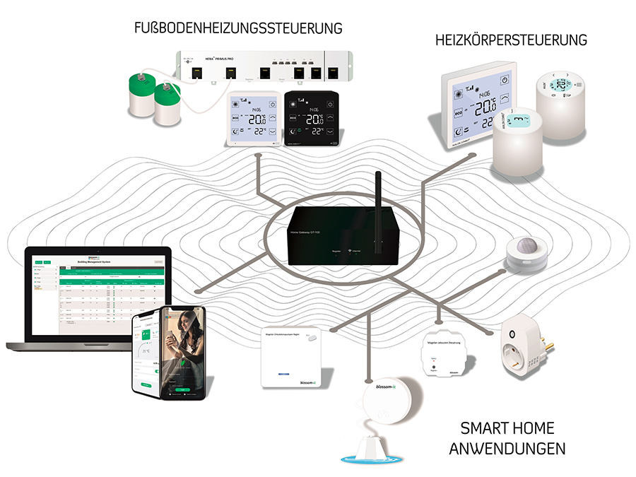 Beim digitalen hydraulischen Abgleich sind die blossom-ic-Thermostate über ein Gateway miteinander vernetzt. Bewegungssensoren und die Steuerung per App, Building Management System oder Touchscreen machen die Steuerung komfortabel. Bild: blossom-ic