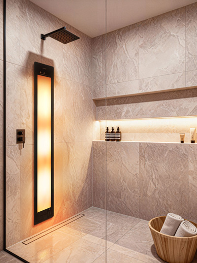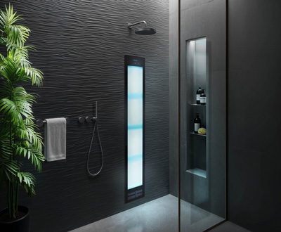 Ein Standard-Feature für ein gesundheitsorientierter Badezimmer kann beispielsweise eine Sunshower sein. Das System bringt Infrarotwärme und niedrig dosiertes UV-Licht direkt in die Dusche und verwandelt das Bad zu einem Gesundheitsraum für den alltäglichen Gebrauch. Eine Sunshower kann ganz einfach während des Duschens genutzt werden: Per Knopfdruck die Infrarot-Funktion oder UV-Funktion aktivieren und den Duschvorgang fortsetzen. Das Gerät schaltet sich automatisch nach zehn Minuten ab.