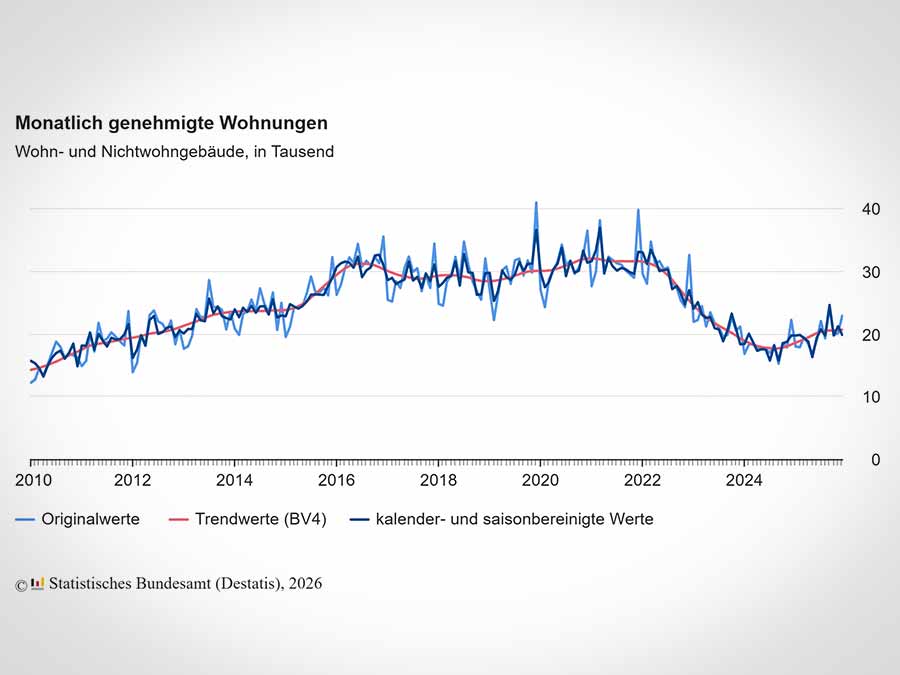 Die Anstiege der Baugenehmigungen sind vor allem bei Ein- und Mehrfamilienhäusern zu verzeichnen. Damit stieg die Zahl der Baugenehmigungen für Wohnungen im Jahr 2025 erstmals seit 2021 wieder an. 2024 war die Zahl genehmigter Wohnungen auf den niedrigsten Stand seit 2010 gesunken. Die Zahl der gemeldeten Baugenehmigungen ist ein wichtiger Frühindikator für die zukünftige Bauaktivität.