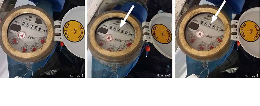 Die Bilder zeigen einen Sprung um 100 m³ (von 5360 auf 5461 m³). Im Verlauf dieses Falles soll sich die Verbrauchsabweichung in der laufenden Abrechnung auf rund 5000 m³ belaufen haben, sagte uns der Sachverständige. Der betroffene Verbraucher hatte hier jedoch Glück im Unglück, wie Hofman weiter berichtet: „Dem Versorger lagen Informationen über die Problematik vor. Es wurde auf die Bezahlung der Mehranzeigemenge verzichtet und ein Durchschnittswert aus den vergangenen Jahren in Rechnung gestellt.“