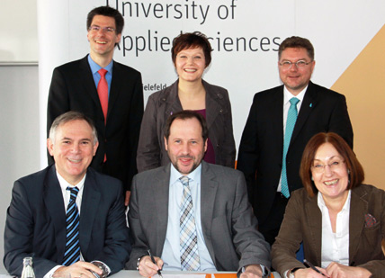 Gut gelaunt ins neue Projekt. Unten von links: Dr. Eduard Sailer (Miele), Prof. Dr. Lothar Budde (Dekan FH Bielefeld), Prof. Dr. Beate Rennen-Allhoff (Präsidentin FH Bielefeld). Oben von links die Mitglieder des Lenkungsausschusses: Dr. Holger Ernst (Miele), Prof. Dr. Sonja Heitmann und Prof. Dr. Christian Schröder (beide FH Bielefeld, Fachbereich Ingenieurwissenschaften und Mathematik).