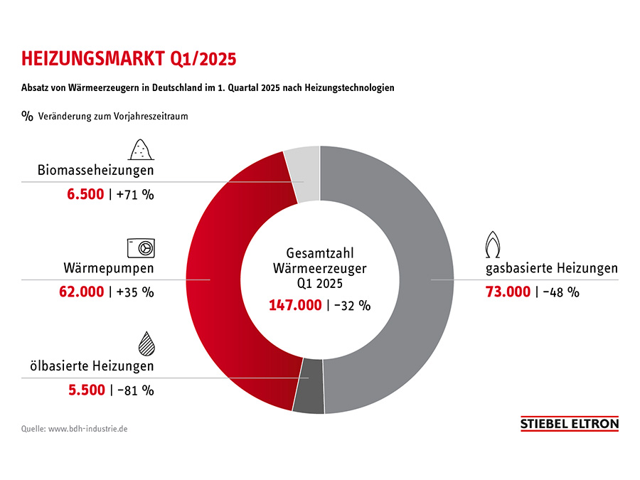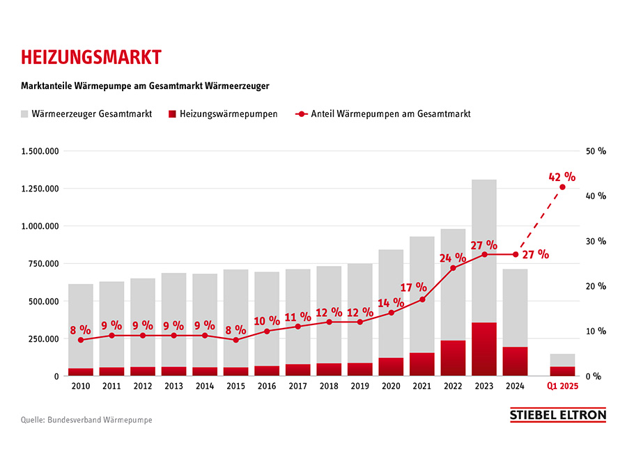 „Ohne Wärmewende wird die Energiewende in Deutschland nicht gelingen – deswegen sind die neuesten Zahlen eine gute Nachricht“, sagt Heinz-Werner Schmidt, Geschäftsführer von Stiebel Eltron. „Der 42-%-Marktanteil der Wärmepumpe im Wettlauf der Wärmeerzeuger im ersten Quartal 2025 zeigt, dass die Wärmewende jetzt stattfindet. Im gesamten Jahr 2024 lag die Quote noch bei 27%, vor zehn Jahren waren es gerade mal 8%.“