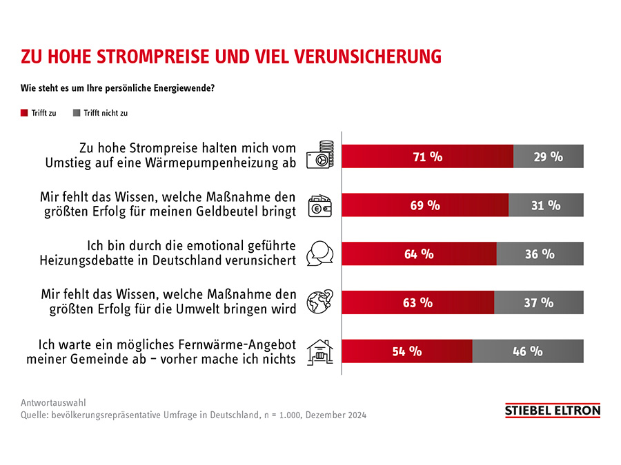 Damit liegt der Anteil von Wärmepumpen am gesamten Heizungsmarkt in Deutschland im ersten Quartal bei 42%. Das neue Kaufverhalten der Verbraucher hatte sich bereits im Dezember abgezeichnet: In einer Umfrage lehnten 70% der Kunden eine Ölheizung und 60% den Einbau eines Gas-Wärmeerzeugers ab. Das sind Zahlen aus dem Energie-Trendmonitor Deutschland 2025, für den ein Marktforschungsinstitut im Auftrag von Stiebel Eltron 1000 Bürger befragte.