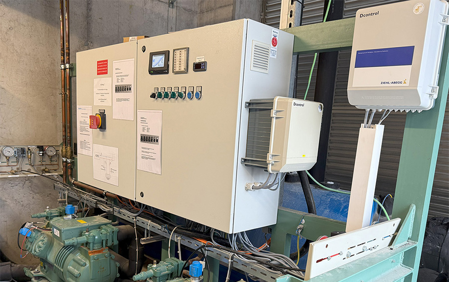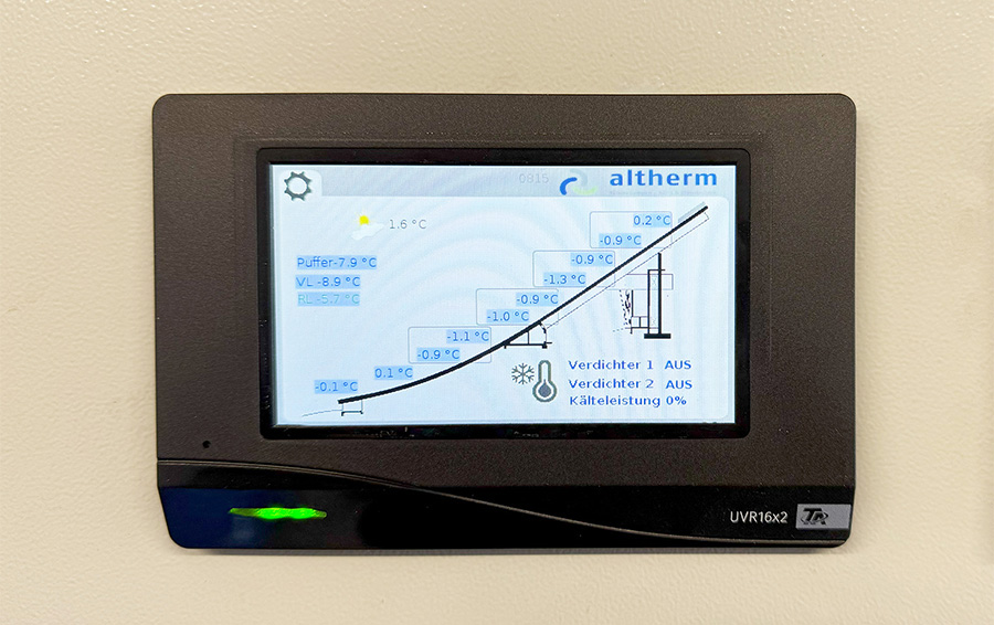 Eine entscheidende Verbesserung war die Umrüstung der Kältemaschine von vormals zwei auf nun sechs Leistungsstufen. Diese werden über „UVR610S“ Universalregler von Technische Alternative angesteuert. Dadurch wurde eine präzise Anpassung der Leistung an den aktuellen Bedarf möglich. Zusätzlich findet eine Kommunikation über Modbus (RTU RS485) mit den elektronischen Expansionsventilen statt. Die Verflüssigungsdruckregelung der Anlage arbeitet mit einem 0-10V Signal, das gleitend an die Außentemperatur angepasst wird.