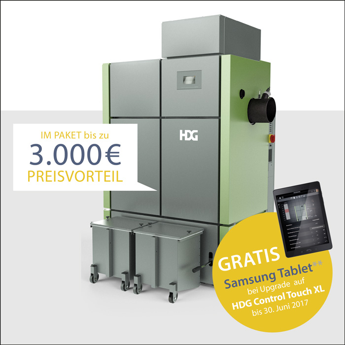 Das Jubiläum feiert der bayerische Holzheizkessel-Hersteller mit einer besonderen Aktion: Im Paket mit Brennstoffzuführung, Entaschung und Zubehör-Paket bietet das Familienunternehmen die „HDG Compact“ im Leistungsbereich von 50 bis 80 kW mit einem Preisvorteil von bis zu 3000 Euro inkl. Mehrwertsteuer an. Bis Ende Juni haben Käufer obendrein die Möglichkeit, ein Samsung-Tablet gratis zu erhalten. Zusammen mit dem Kommunikationsportal „myHDG“ ermöglicht das Tablet den mobilen Zugriff auf das Heizsystem – inklusive Web-App und E-Mail-Benachrichtigung. Alle Infos zum Hackschnitzel-Paket finden Interessierte unter www.hdg-bavaria.com.