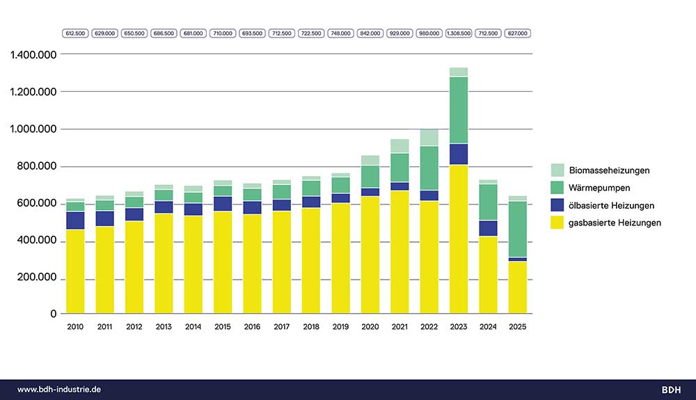 Köln/Berlin. Der Absatz von Heizungen ist in Deutschland im Jahr 2025 auf den niedrigsten Stand seit 15 Jahren gefallen. Die Jahresbilanz des Bundesverbands der Deutschen Heizungsindustrie (BDH) weist für das vergangene Jahr rund 627000 verkaufte Anlagen aus. Das sind 12 % weniger als im bereits schwachen Vorjahr. Damit ist der Heizungsmarkt in Deutschland das zweite Jahr in Folge rückläufig.