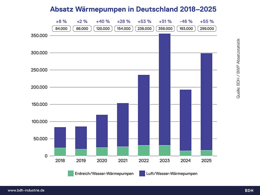 Während Wärmepumpen zuletzt mit rund 299000 verkauften Geräten und einem Wachstum von 55 % gegenüber dem Vorjahr zulegten, können sie allein den Einbruch im Gesamtmarkt nicht kompensieren. So wurde das noch unter der Ampel beschlossene Ziel von 500000 installierten Wärmepumpen pro Jahr ab 2024 das zweite Jahr in Folge deutlich verfehlt. Auch Heizsysteme auf Basis von Biomasse, etwa Pelletanlagen, verzeichneten eine leichte Erholung, liegen mit 29000 abgesetzten Geräten jedoch weiterhin auf niedrigem Niveau.