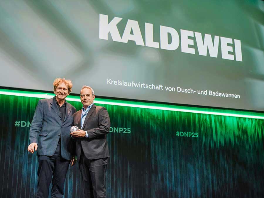 Die Jury des Deutschen Nachhaltigkeitspreises würdigte insbesondere den Beitrag zur Kreislaufwirtschaft in einem Segment, das bislang stark auf Neubauprodukte ausgerichtet ist. „Mit der Wiederaufbereitung von Duschflächen und Badewannen aus Stahl-Emaille schafft Kaldewei neue Maßstäbe für einen nachhaltigen Sanierungsansatz im Projekt- und Objektgeschäft“, heißt es in der Begründung. Der Preis wurde von Prof. Dr. Michael Braungart an Roberto Martinez, Executive Board Member von Kaldewei, übergeben.