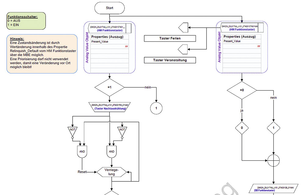 Sofern der beauftragte GA-Planer nicht bereits als Integrationsplaner aktiv auf das GA-Gesamtsystem und die betreffenden TGA-Anlagenkomponenten mitwirkt, basiert seine Tätigkeit auf den gültigen Normen und Richtlinien, den Vorgaben des Auftraggebers (wie Lastenhefte) und den Vorleistungen der beteiligten TGA-Fachplanung. Hier ist mindestens ein Verständnis und das Anwenden der aktuellen Normen DIN EN ISO 16484 [7] sowie der Richtlinien VDI 3814 und VDI 3813 [8] nötig – unter Beachtung der Vorgaben der DIN 18386 [9], „Allgemeine Technische Vertragsbedingungen für Bauleistungen (ATV) Gebäudeautomation“ (VOB Teil C). Die beste Planungsvoraussetzung ist allerdings, die allgemein anerkannten Regeln der Technik, die Wünsche der zukünftigen Betreiber und Nutzer zu berücksichtigen sowie die Bauherrenanforderungen normenkonform umzusetzen.