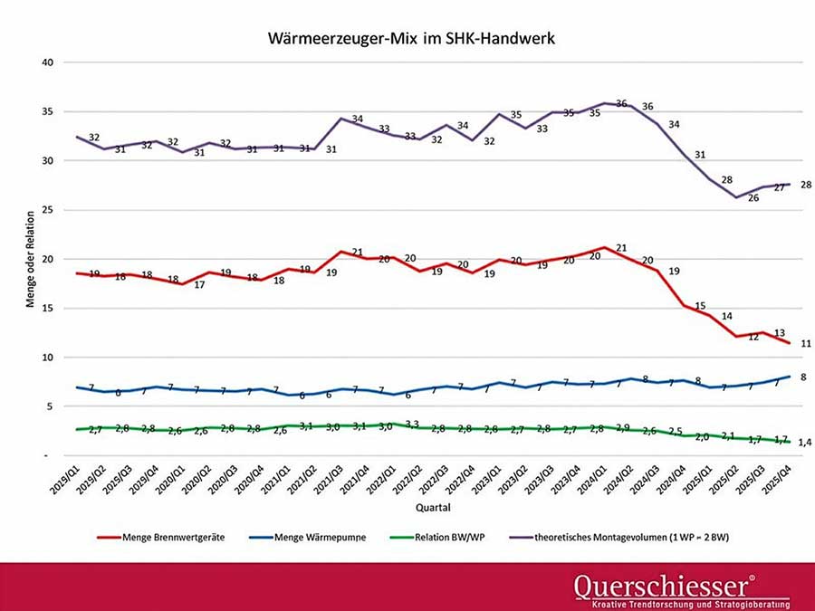 Xanten. „Das Handwerk hat die Sanitäraufträge für sich wiederentdeckt und die Montagekapazitäten umgeschichtet. Auch ein Grund, warum ich für 2026 nicht an ein explodierendes Wärmepumpen-Geschäft glaube“, sagt Unternehmensberater und Marktforscher Arno Kloep bei der Vorstellung der Zeitreihen für die durchschnittlichen Absatzmengen von Brennwertgeräten und Wärmepumpen. Die Querschiesser Unternehmensberatung ermittelt diese regelmäßig.