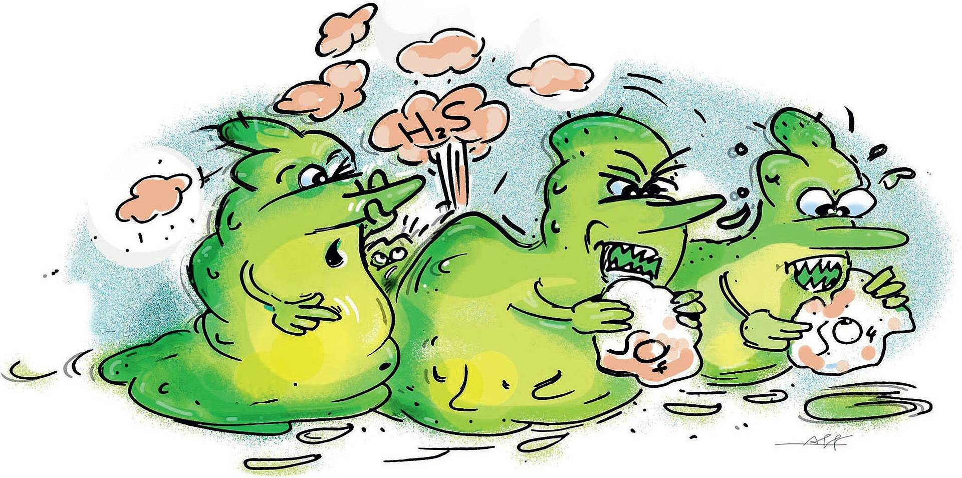 Auf der anderen Seite können spezielle Mikroorganismen, wie z. B. Sulfatreduzierer, das eventuell im Füllwasser bereits enthaltene Sulfat (Kalziumsulfat = Gips) oder zu Natriumsulfat abreagiertes anorganisches Sauerstoffbindemittel zu Sulfid oder elementarem Schwefel reduzieren. Beide Stoffe fördern die Korrosion von Schwarzstahl ungemein, man spricht dann von mikrobiell beeinflusster Korrosion MIC. Ein erster Hinweis für die erhöhte Wahrscheinlichkeit von MIC kann ein Sulfat-/Nitrat-Defizit sein, also der Konzentrationsunterschied an diesen beiden Salzen zwischen Nachfüll- und Anlagenwasser, sofern das Wasser nicht aufbereitet oder lediglich enthärtet wird. Bei entsprechendem Defizit sind die beiden Salze signifikant in die korrosiveren Formen reduziert worden. Auch der Geruch nach faulen Eiern (Schwefelwasserstoff) ist natürlich ein eindeutiger Hinweis.