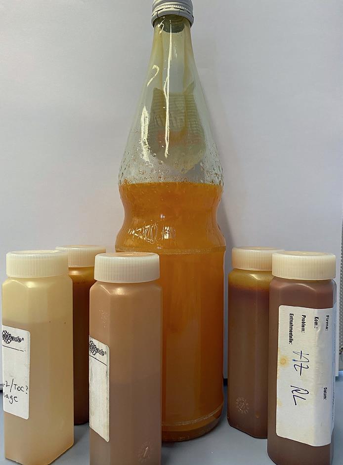 Um den TOC-Wert zu bestimmen, werden im Labor die organischen Verbindungen durch ein starkes Oxidationsmittel vollständig zu Kohlendioxid umgesetzt, das mit einem entsprechenden Detektor erfasst werden kann. Das gegenüber Ethylenglykol ungift ige Frostschutzmittel Propylenglykol (1,2-Propandiol) hat die chemische Formel C3H8O2, mit einem Kohlenstoff anteil von ca. 47 Massenprozent. Werden nun 1000 l Anlagenwasser mit 0,5 l Propylenglykol (Dichte 1,04 g/cm3) verschmutzt, so zeigt die Wasserprobe im Labor einen TOC-Wert von 500 x 1,04 x 0,47 = 245 g/m3 bzw. 245 mg/l an.