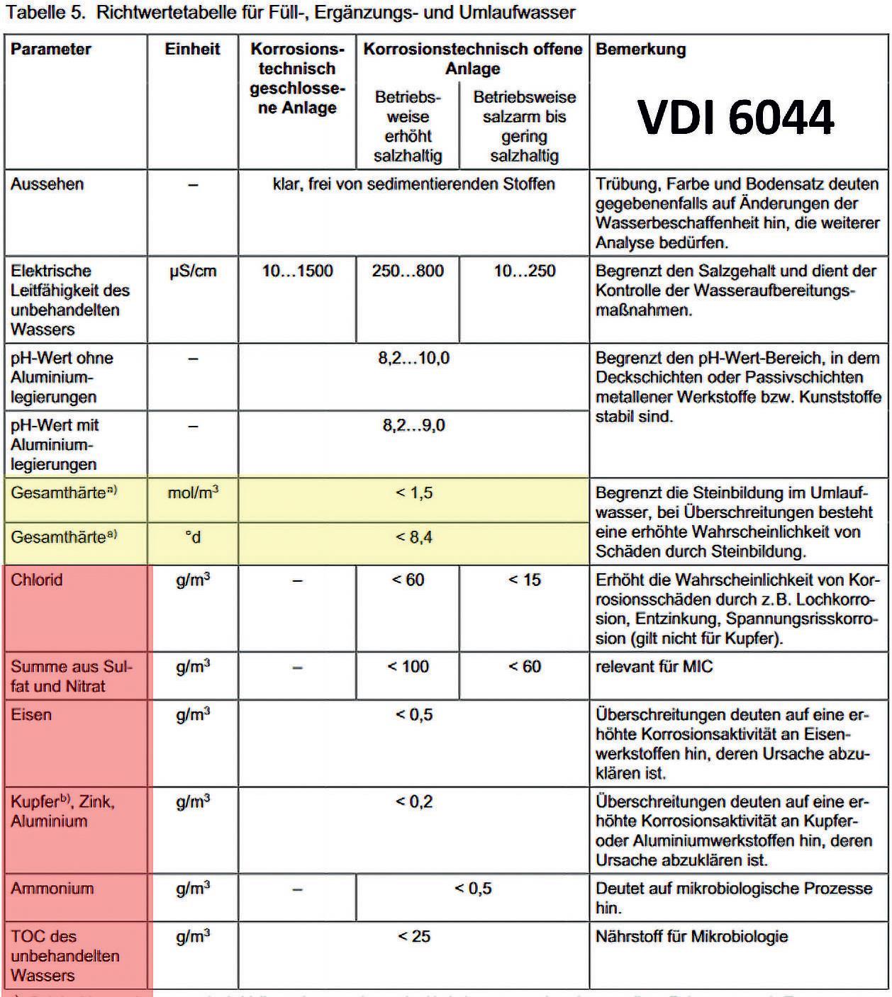 Seit mehreren Jahren ist der Kältebedarf in der Gebäudeklimatisierung und industriellen Prozesskühlung deutlich gewachsen. Gleichzeitig sind Energieeffizienz, Anschaffungs- und Betriebskosten zu berücksichtigen, was zur Folge hat, dass in kompakt konstruierten und komplexen Anlagen eine Vielzahl unterschiedlicher Werkstoffe verbaut werden. Nicht selten kommt es dann bereits kurz nach Inbetriebnahme zu Korrosionserscheinungen, die ihre Ursache entweder in der chemischen Zusammensetzung des Anlagenwassers, Sauerstoffeintrag und/oder in mikrobiologischen Prozessen haben. Mit der neuen VDI/BTGA-Richtlinie 6044 wurde hier eine wichtige Lücke, auch im Hinblick auf sogenannte Change-Over-Systeme, geschlossen. Gegenüber der VDI-Richtlinie 2035 für Heizsysteme, hat sich die Anzahl der zu prüfenden Parameter im Umlaufwasser deutlich erhöht. Anders als in der VDI 2035 haben wir es in der VDI/BTGA-Richtlinie 6044 mit keinem (kälte)leistungsabhängigen Parameter zu tun. In der VDI 2035 ist die zulässige Resthärte direkt und auch indirekt – über das spezifische Anlagevolumen – leistungsabhängig vorgegeben. Im Kalt- und Kühlwasser darf die Härte maximal 1,5 Mol/m3 (8,4°d) betragen. Während nach der VDI 2035 nur noch die weiteren Parameter pH-Wert und elektrische Leitfähigkeit begrenzt und daher zu kontrollieren sind, benennt die Tabelle 5 in der Richtline 6044 zudem Richtwerte für die Konzentration an Chlorid, die Summe aus Sulfat und Nitrat, Eisen, Kupfer, Zink, Aluminium, Ammonium und TOC – was einen erhöhten Untersuchungsaufwand mit sich bringt. Dieser hat primär zwei Ursachen. Zum einen werden durch die Richtlinie VDI 6044, im Gegensatz zur VDI 2035, auch korrosionstechnisch offene Anlagen erfasst, also geschlossene Systeme mit einem geringen Zutritt von Sauerstoff , wie auch in der EN 14868 beschrieben. Sauerstoff gilt als der Primärverursacher von Korrosionsschäden. Chloridionen beispielsweise erhöhen die Wahrscheinlichkeit für Korrosionsschäden erst bei Anwesenheit eines Oxidationsmittels wie z. B. Sauerstoff, daher ist deren Konzentration in diesem Fall auf 60 mg/l limitiert. Die Konzentration an gelösten Metallen ist ein Hinweis für erhöhte Korrosionsaktivitäten, deren Ursache abzuklären ist. Falsche pH-Werte oder auch ungünstige Werkstoffkombinationen wirken hier – neben Sauerstoff – maßgeblich mit ein.