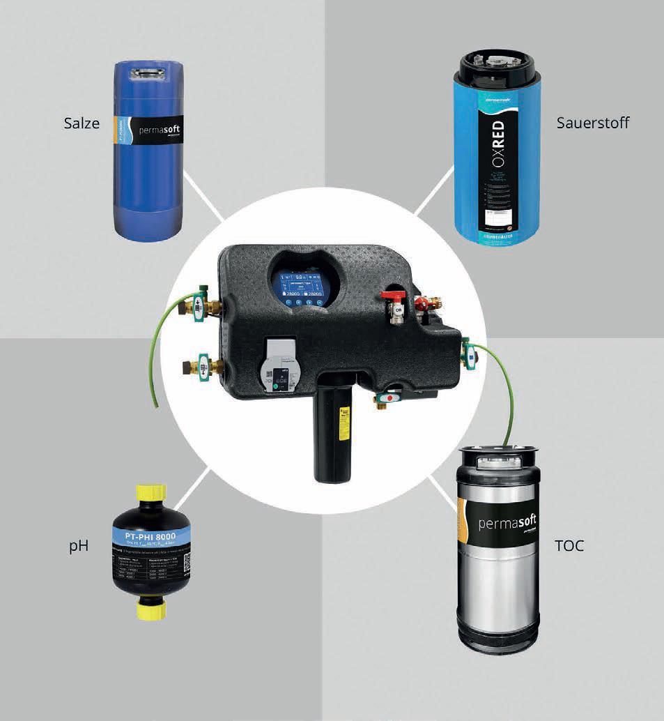 Belastete Anlagen im Feld zeigen oftmals ei-nen TOC-Wert bis 2000 mg/l, gleichzeitig ist i. d. R. dann auch der pH-Wert sehr niedrig und das Anlagenwasser enthält bereits viel gelöstes Eisen. Hier sollte zunächst mit Leitungswasser gut gespült und das Umlaufwasser dann vorzugsweise im Teilstrom-verfahren weiter aufbereitet werden. Das Anlagenwasser wäre dabei weitgehend zu entsalzen (LF 60 μS/cm), auch um dessen Pufferung zu vermindern und nebenbei das gelöste Eisen zu entfernen. Bleibt zu viel gelöstes Eisen im Wasser erhalten, so fällt dieses bei der pH-Korrektur ins Alkalische als Eisenhydroxid-Schlamm aus und kann ggf. Filter verblocken. In einem weiteren Arbeitsgang sind die organischen Substanzen, wie degradierte Glykolreste oder auch organische Inhibitoren, durch intensive Teilstromfiltration über Aktivkohle bestmöglich zu eliminieren. Andernfalls darf davon ausgegangen werden, dass sich der pH-Wert in Laufe der Zeit erneut absenken wird, oder ein mit anodisch wirkendem Korrosionsinhibitor konditioniertes Anlagenwasser im Bereich der kritischen Unterinhibierung verbleibt. Dies wiederum erhöht das Risiko für Lokalkorrosionserscheinungen. Abschließend wird ein alkalisierender pH-Stabilisator eingespült. Alle Arbeitsschritte lassen sich z. B. sehr einfach mit der multifunktionalen, kompakten Teilstromaufbereitungseinheit „permaLine mobil“ oder „permaLine integral“ ausführen. Voraussetzung für den Verfahrenserfolg ist dabei immer das vollständige Erfassen des Anlagevolumens.