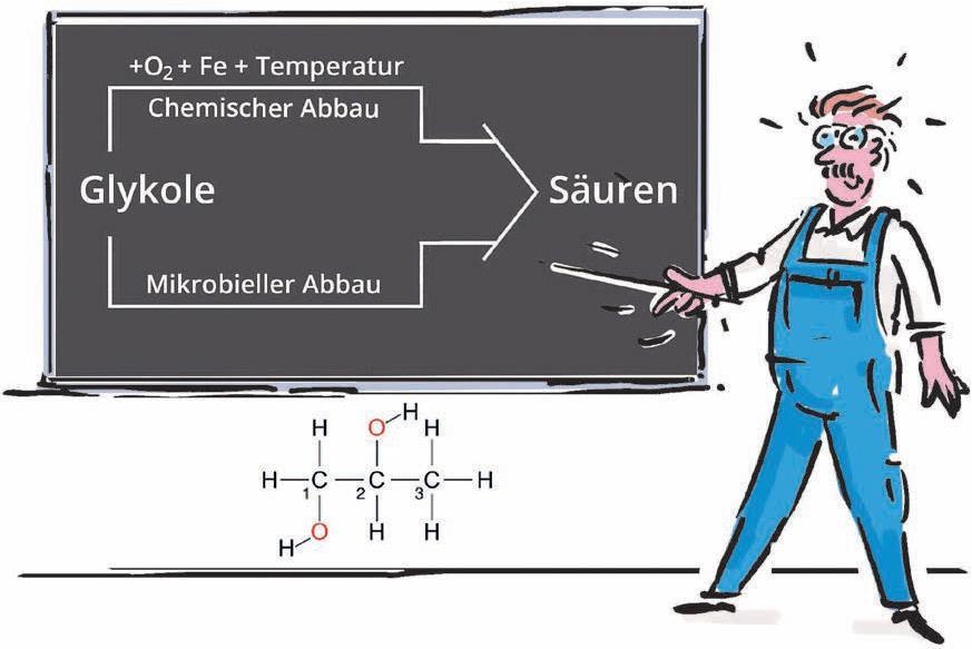 Nicht selten kommt es vor, dass der pHWert im Anlagenwasser im Laufe der Zeit immer weiter abfällt, wobei in extremen Fällen sogar pH-Werte um 4 erreicht werden. In der Folge kommt es zu massiver Säurekorrosion an niedrig legierten Bauteilen aus Eisen. Ausgehend von den Richtwerten pH 8,2 - 10,0 ist dabei eine Abweichung um 4 pH-Stufen nach unten gleichbedeutend mit einer um den Faktor 10 000 erhöhten Säureaktivität. Wird jetzt eine Wasserprobe entnommen, verfärbt sich diese durch das Ausfallen von Eisen(III)hydroxidoxid innerhalb von Minuten nach Sauerstoffkontakt orange. Je nach Eisenkonzentration kann das zunächst noch farblose, sauerstoffarme Wasser optisch die Farbintensität von Multivitaminsaft annehmen. Ursache dafür ist der mikrobielle, teilweise auch chemische, Abbau der zunächst pH-neutral reagierenden Glykole zu diversen organischen Säuren. Der chemische Abbau findet dabei vor zugsweise bei höheren Temperaturen in Gegenwart von etwas gelöstem Sauerstoff und Eisenionen statt (s. auch Alterung von Solarflüssigkeiten). Das Hauptabbauprodukt ist in der Regel Essigsäure, weitere Abbauprodukte sind Ameisen-, Propion-, Glykol- und Oxalsäure. Um solchen Abbauprozessen vorzubeugen, gibt die Richtlinie die Empfehlung (VDI 2035, Ausgabe 03/21): „Einmal für Wasser-Frostschutzmittel-Befüllungen genutzte Komponenten nicht für die Heizungsanlage nutzen.“