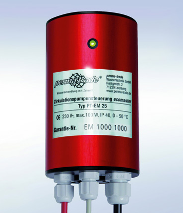 Mit einer bedarfsgerechten Zirkulationspumpensteuerung wie dem „ecomaster“ können vor allem bei älteren Einfamilienhäusern mit schlecht gedämmten Zirkulationsleitungen Einsparpotenziale realisiert werden. Durch das kurze Öffnen und wieder Schließen einer beliebigen Warmwasserarmatur wird der „ecomaster“ angesteuert und die Zirkulationspumpe eingeschaltet. „Das warme Wasser steht so nach kurzer Zeit an jeder Warmwasser-Zapfstelle zur Verfügung und kann entnommen werden“, erklärt Perma-trade weiter. Die Steuerung schaltet die Pumpe wieder ab, sobald das Wasser den Temperaturfühler am Zirkulationsrücklauf die werkseitig eingestellte Temperatur von 40°C erreicht hat.