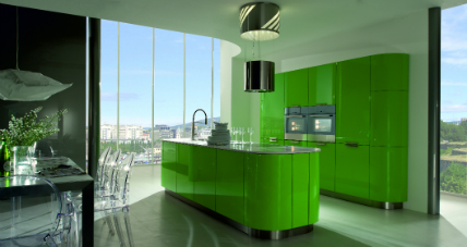 Speziell für die Bedürfnisse des Küchen-Fachhandels entwickelt wurde das Programm Rialto, hier in leuchtendem Grün mit gerundeten Rondo-Elementen. Es soll mit seiner besonders vielfältigen Farb- und Formensprache kaufentscheidende Differenzierungsmöglichkeiten bieten und den Fachhandel in die Lage versetzen, wirklich maßgeschneiderte Lösungen umzusetzen.