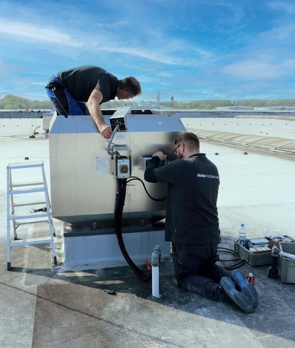 Montage der Lager-Zustandsdiagnostik: Servicetechniker rüsten einen Brandgas-Dachventilator direkt vor Ort mit der intelligenten LZD aus. (Helios Ventilatoren)