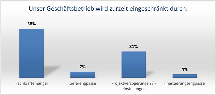 Vor allem der Fachkräftemangel führt bei Kälte-Klima-Fachbetrieben zu Einschränkungen im Geschäftsbetrieb. 58 % der Teilnehmenden nannten dies als wichtigsten Grund; 31 % sind von Projektverzögerungen und -einstellungen betroffen. Liefer- (7 %) und Finanzierungsengpässe (4 %) stellen laut Umfrage keine größeren Probleme für die Branche dar.