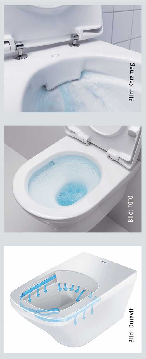 Die Wasserführung spielt außerdem beim Schutz vor Spritzwasser eine Rolle – wichtig für WCs ohne Spülrand. Hier haben namhafte Hersteller die Wasserführung so optimiert, dass kein Überspritzen erfolgt.
