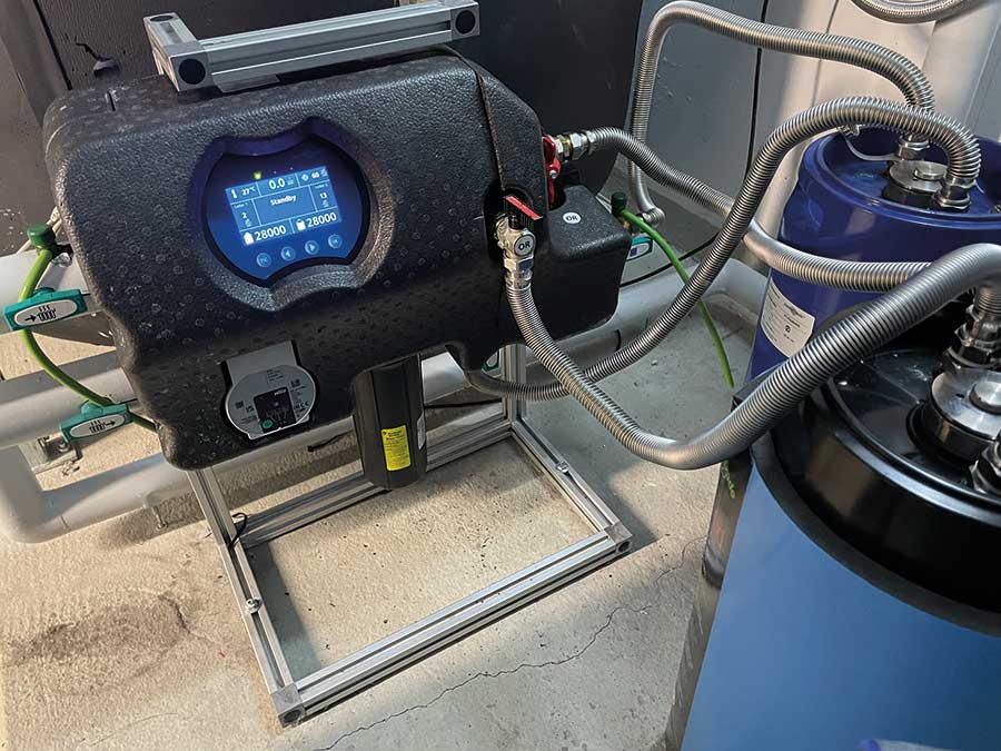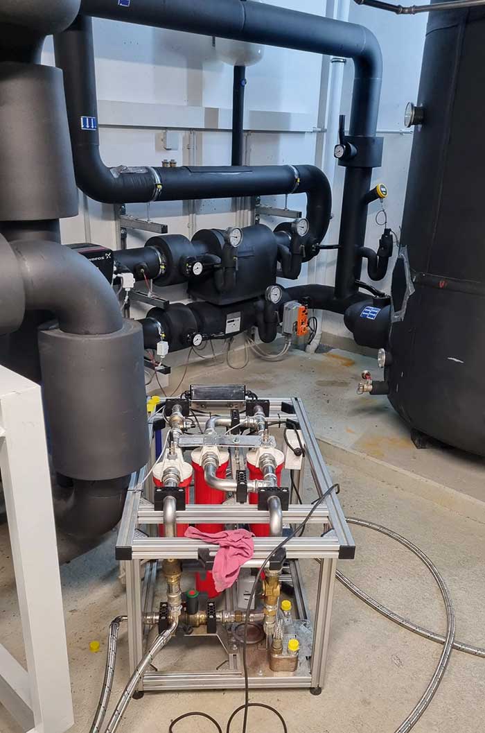 Die Wasserprobe vor Ort ergab vor der Aufbereitung eine Gesamthärte von 3 °dH, eine elektrische Leitfähigkeit von 250 µS/cm und einen pH-Wert von 6,5. Um diese Wasserparameter nach den Vorgaben der VDI-Richtlinie 2035 optimal einzustellen, wurden 2023 in einer ersten Projektphase zunächst die bereits zugänglichen Teile des Systemwassers in Pufferspeicher und Verteilernetz aufbereitet, was einem Aufbereitungsvolumen von ca. 50 m³ entsprach. Dafür wurde das mobile „XXL-Gerät“ einfach in den Heizkreislauf eingebunden. Nach Durchströmung des integrierten feinporigen Tiefenfilters mit 1 µm, der selbst kleinste Partikel von Trübstoffen, wie Magnetit, entfernt, wurde das Anlagenwasser über die angeschlossene „permasoft“-Einheit entsalzt.
