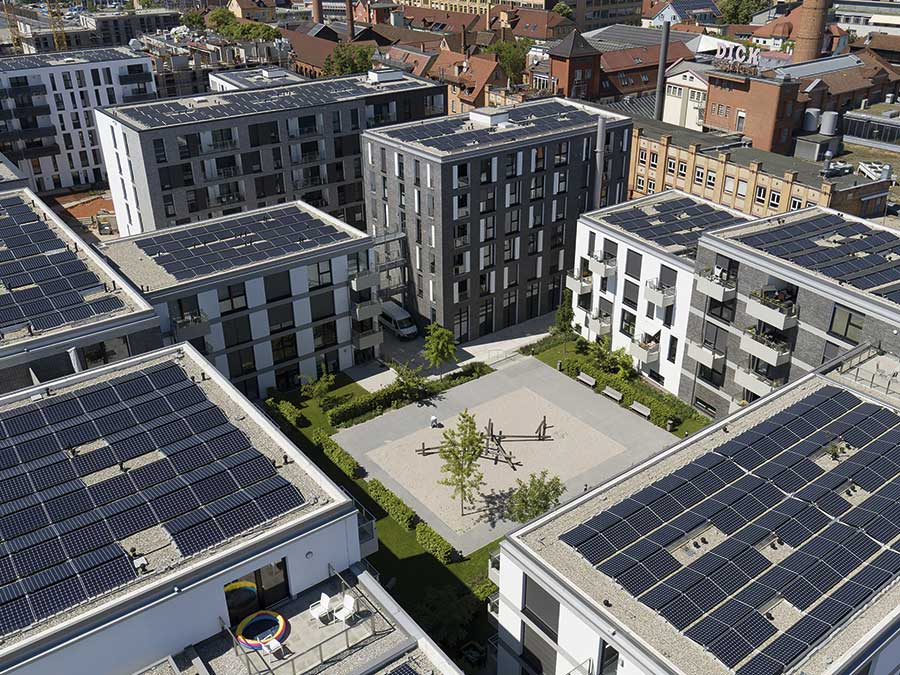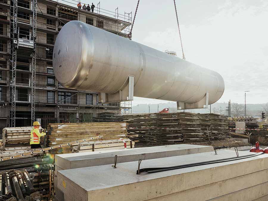 Auf dem Areal des alten Güterbahnhofs wurden in der „Neuen Weststadt“ fünf Gebäudekomplexe im KfW 55-Effizienzstandard errichtet, die 480 Wohnungen, Büro- und Gewerbeflächen sowie einen Neubau der Hochschule Esslingen umfassen. Über PV-Anlagen auf den Dachflächen und Blockheizkraftwerke werden die dortigen Mieter mit Strom versorgt. Alles, was davon nicht direkt im Quartier genutzt wird, sowie weiterer überschüssiger erneuerbarer Strom aus lokaler und überregionaler Erzeugung wandert direkt in einen Elektrolyseur. Mit einer Leistung von 1 MWel ist er das Herzstück der Energie- und Technikzentrale des Quartiers und erzeugt mit Power-to-Gas-to-Power-Technologie (P2G2P) „grünen Wasserstoff“. Vereinfacht ausgedrückt, wird dabei Wasser mit Hilfe von Strom durch Elektrolyse in seine Bestandteile Wasserstoff und Sauerstoff zerlegt. Wasserstoff gilt als Schlüsseltechnologie der Energiewende: Er erzeugt bei seiner Verbrennung keine schädlichen CO2-Emissionen und lässt sich zudem in großen Mengen erzeugen, transportieren und vor allem: Speichern. Dazu wurde im Klimaquartier ein eigener Wasserstofftank eingebaut, so dass der hier erzeugte Wasserstoff zwischengelagert werden kann. Bis zu 85 t Wasserstoff sollen im Klimaquartier Esslingen künftig hergestellt werden. Das entspricht dem Jahresstromverbrauch von 726 Drei-Personen-Haushalten oder 280 000 l Öl.