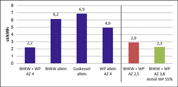 Die Heizkennzahl der Kombination Wärmepumpe/BHKW lag im Jahr 2012 bei 1,85, das heißt, dass mit 1 kWh Gas 1,85 kWh Wärme erzeugt werden konnten. Im Sinne einer wirtschaftlichen Betriebsweise wurde außerdem festgestellt, dass die eingestellte Betriebsweise „Parallelbetrieb von Wärmepumpe und BHKW in der Grundlast, Deckung der Mittellast mit dem BHKW und Spitzenlast mit dem Gasheizkessel“ grundsätzlich die günstigste Lösung ist. „Nur war die Auslastung der einzelnen Komponenten nicht optimal. Um sie zu verbessern, musste in erster Linie das Zusammenspiel von Wärmepumpe und BHKW justiert werden“, wie Guigas erklärt. Es galt, die Wirtschaftlichkeit soweit wie möglich zu steigern, ohne die angestrebte CO2-Reduktion von 41% gegenüber der Referenz (Gas-Brennwertkessel in jedem Gebäude) zu unterschreiten. Der Anteil der Wärmepumpe bzw. deren Sollwert für die Vorlauftemperatur wurde daraufhin um 3 K angehoben.