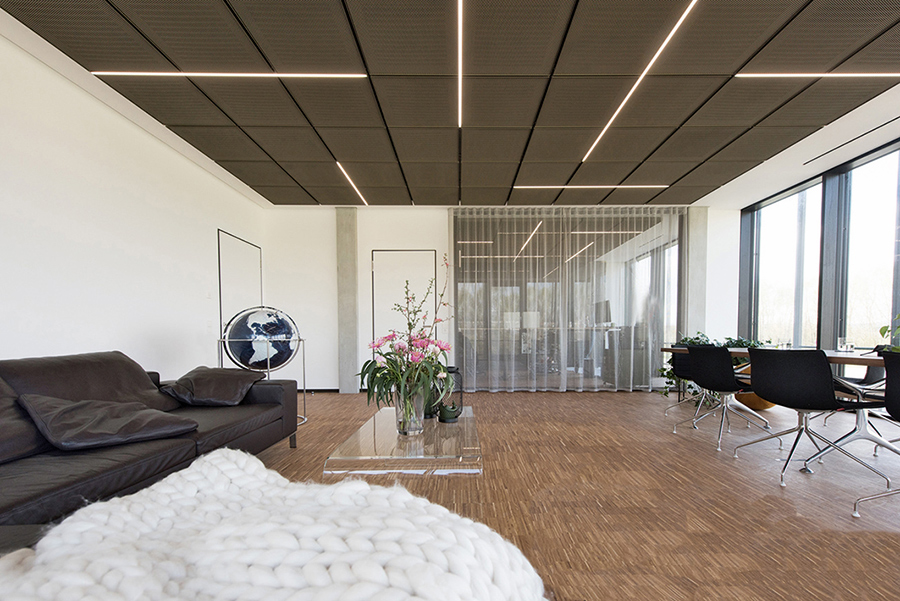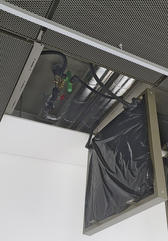 Die einzelnen Elemente des „black system“ wurden im Werk passgenau in den Maßen 56 x 60 cm angefertigt. Im Objekt wurden sie dann in die einzelnen Deckenelemente eingesetzt. Die Zuleitung zwischen den Registern erfolgte mithilfe eines Anschlusswellrohres und eines Steckstutzens. Das Wellrohr ermöglicht eine flexible Anbindung, während der Schnellsteckverbinder mit Sicherungsclip eine dichte, aber lösbare Verbindung schafft.