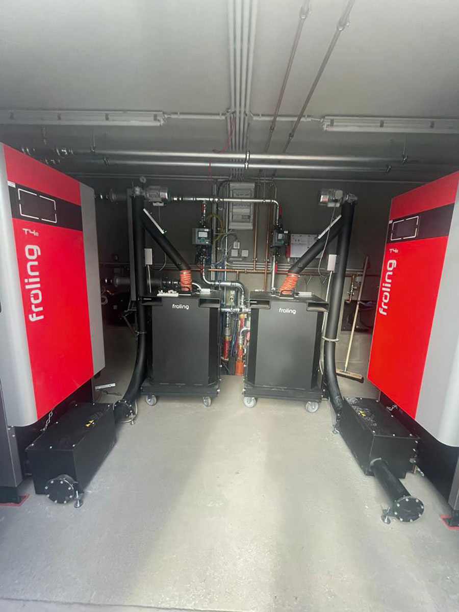 Mit der Installation von zwei Fröling „T4e“ Hackgutheizungen mit jeweils 180 kW Heizleistung am Produktions- und Vertriebsstandort Marchtrenk ist das Unternehmen einen weiteren Schritt in Richtung klimafreundliche Zukunft gegangen. Die Anlage ist in einem außenstehenden Container untergebracht. Eine flexible Lösung, die sich gut in die bestehenden Betriebsstrukturen integrieren ließ. Die Kessel arbeiten in Kaskade, wodurch Lastspitzen abgefangen und Teillastphasen effizient gefahren werden können.