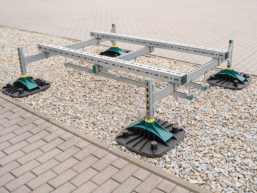 Das neue Montagesystem zur Dachaufständerung mit „BigFoot“-Stellfüßen ermögliche eine stabile und bauschonende Installation. Da keine Verschraubung mit dem Gebäude erforderlich ist, bleibe die Dachmembran unversehrt und das Risiko von Undichtigkeiten werde verringert. Eine integrierte Antivibrationsmatte reduziere den Trittschall. „Die „BigFoots“ verteilen die Last gleichmäßig und lassen sich bis zu 7° an Dachneigungen anpassen. Ein integriertes Ballastierungssystem, befüllbar mit handelsüblichen Gehwegplatten, erhöht die Stabilität bei Windlast“, führt das Unternehmen aus.