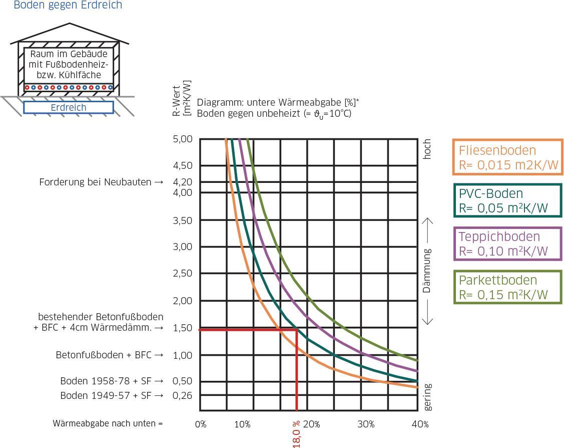 Beispielhaft werden in dieser Grafik die Wärmeverluste bei unter schiedlichen energetischen Qualitäten und Bodenbelägen aufgezeigt. Das Bild stammt aus dem technischen Handbuch von Blanke-Systems. (Blanke-Systems)
