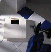 | Aus dem Programm werksseitig vormontierter Duschkabinen "Riva" von Kermi: Die Echtglas-Schwingtür. Die Duschwanne "1930" von Hoesch besitzt vier Ablageecken. |