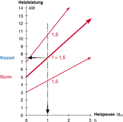 größer als der Normleistungsbedarf. Gleiches gilt für die anderen Normheizleistungen, wie sie stellvertretend in Bild 5 mit 3 kW und 7 kW eingezeichnet sind. Die notwendige Kesselleistung nimmt mit der Länge der Heizpause zu.