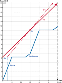 Bild 10 liegt die Abfolge von zwei (oder mehr) Wannenbädern von 30 Minuten Dauer mit jeweils 5,2 kWh Bedarfskapazität (150 L / 40°C) und zusätzlich 0,7 kWh für die Handbrause zugrunde. Die Erwärmleistung ergibt sich ebenfalls aus der Steigung der Heizlinie (