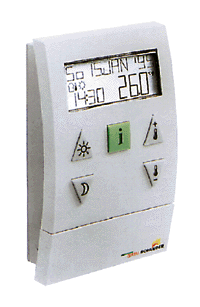 Der hohe Bedienkomfort wird dadurch garantiert, daß die Programmierung von Schaltzeiten und der gewünschten Raumtemperaturen aus dem Brennwertgerät entkoppelt wurde. Zur Raumtemperaturführung und zur Nachtabsenkung wird bei den wandhängenden Brennwertgeräten mit einer Leistung von 9 bis 20 kW und 11 bis 28 kW ein Uhrenthermostat verwendet. Dieser wird über eine 2-Draht-Leitung direkt an das Brennwertgerät angeschlossen.