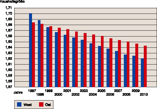 Starke Zuwächse um 12,8% gab es zwischen 1987 (26,3 Mio.) und 1997 (29,7 Mio.) auch bei der Anzahl der Haushalte in Westdeutschland. Gleichzeitig wurden dem Wohnungsbestand in Ostdeutschland zwar 830000 neue Wohnungen zugeführt, aber der Gesamtbestand erhöhte sich zwischen 1988 und 1997 dennoch nur um ca. 320000 Wohnungen. Bei der Prognose bis 2010 geht die Pestel-Studie von einem weiterhin wachsenden Haushaltsbestand aus (+6,6% in Westdeutschland und +7,4% in Ostdeutschland). Man erwartet gleichzeitig allerdings eine abnehmende Haushaltsgröße.