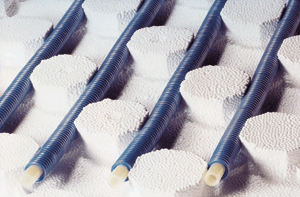 Mit dem neuen Fußbodenheizungssystem "Polycomfort" ist es möglich, die Rohre diagonal auf der Trägerplatte zu verlegen, ohne daß Klemmhilfen erforderlich werden. Darüber hinaus entsteht durch die druckknopfartige Verlegung der Noppensystemplatten eine geschlossene Fläche, die insbesondere den Einsatz von Fließestrich erlaubt. Die Ochtruper heben den umweltschonenden Verschnitt hervor, er liegt nach Firmenaussage bei lediglich 1 bis 2%.