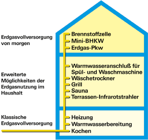 Wenn heute dagegen vom erdgasvollversorgten Haus der Zukunft gesprochen wird, ist etwas anderes gemeint: die Ausdehnung des Erdgaseinsatzes im Haushalt auf neue oder bisher kaum genutzte Verbrauchssektoren bis hin zu einer Maximallösung, die den gesamten Strom- und Wärmebedarf des Gebäudes ausschließlich auf Erdgasbasis deckt und auch den Pkw mit Kraftstoff versorgt.