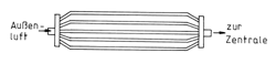 1. Anstelle von Rechteckkanälen werden die Wärmeübertrager wegen der besseren Wärmeübertragung sowie aus Kosten- und Festigkeitsgründen meistens aus genormten Rohren hergestellt - vorwiegend aus der Entwässerungstechnik. Diese Rohre können dann entsprechend Bild 4 als Register angeordnet werden, mit stirnseitigem Sammel- und Verteilrohr. Die Anzahl der Rohre bestimmen den Verlegeabstand bzw. den Platzbedarf und den Rohrdurchmesser. Letzterer hat wieder Einfluss auf Luftgeschwindigkeit, Wärmeübergang, Druckverlust und Kosten.