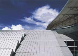 | Trennlagen bei Metallbedachungen - ja oder nein?Bild 1: Teilansicht Flughafendach Oslo-Gardermoen, ausgeführt in Doppelstehfalztechnik, mit "vorbewittertem" Titanzink. Beim fachgerecht ausgeführten Metalldach entscheiden objektspezifische Begleitumstände, ob Trennlagen erforderlich sind, oder nicht. Bauherr: Oslo Lufthavn AS, Oslo, Norwegen; Architekt: Aviaplan AS, Oslo. Die Metalldächer wurden ausgeführt durch: Varla Plat AG, Kungsbacka, Schweden; Edvin Hansen & Sons AS, Gjovik, Norwegen und Franke Onsrud Blikkslageri AS, Oslo. (Foto: Rheinzink) |