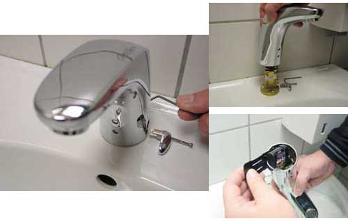 Die Montage der Armaturen ist einfach und für den Fachbetrieb kein Problem. Lediglich bei der Spannungsversorgung über das Stromnetz kommt der elektrische Anschluss hinzu. Der notwendige Wechsel der Batterie wird rechtzeitig vor vollständiger Entladung durch eine rot blinkende Sensorlinse angezeigt. Auch der Wechsel der Batterie oder des Magnetventils ist ohne besondere Vorkenntnis denkbar einfach. Durch Lösen von zwei Schrauben öffnet man das Armaturengehäuse in der die Batteriehalterung eingesetzt ist.