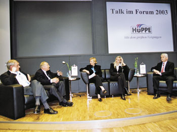 | Vier Spezialisten mit höchst unterschiedlicher Perspektive auf die Branche (von links): Fritz Hollweg (Gottschall + Sohn), Professor Gert Gutjahr (Institut für Marktpsychologie), Moderatorin Dr. Angela Sälzer, Industriedesignerin Jette Joop und Dr. Ulrich Gruß (LBS Landesbausparkasse West). |