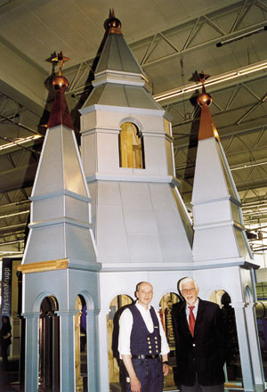 | Beeindruckendes Exponat auf der "Dach+Wand" war dieser Kirchturm, gestaltet in verschiedenen Metallen und hier vorgestellt durch Harald Koch (re.), GF Technik beim LIV SHK, Hamburg und Andreas Witt, Ausbildungsmeister beim Berufsbildungswerk der Innung Sanitär Heizung Klempner, Hamburg. |