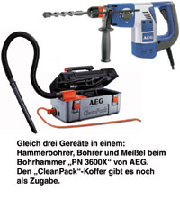 Bis zum Jahresende ist beim Kauf des Bohrhammers "PN 3600 X" zusätzlich ein CleanPack - ein robuster Werkzeugkoffer mit integriertem Staubsauger - im Lieferumfang enthalten, teilt AEG mit.