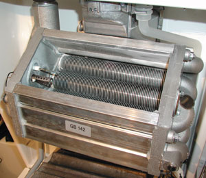 | Wärmetauscher Gas Brennwertkessel mit demontiertem Brenner. |