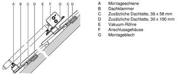 Um das Anschlussgehäuse (F) sicher auf dem Dach befestigen zu können, werden zunächst auf die Dachklammern der oberen Reihe Montagebleche gelegt. Erst dann können die Montageschienen auf der oberen und unteren Reihe der Dachklammern mit Klemmsteinen befestigt werden. Dabei muss darauf geachtet werden, dass es zwei unterschiedliche Schienen gibt. Auf der unteren Montageschiene (A) sind für jede Röhre Klemmen angebracht, die obere Montageschiene verfügt dagegen über eine Röhrenauflage aus Gummi.