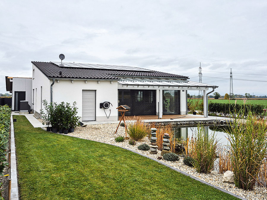 Der Bungalow in Tabertshausen mit rund 100 m² Wohnfläche wird von zwei Personen bewohnt und verfügt über ein zusätzliches Büro unter dem Dach. Für eine von fossilen Brennstoffen unabhängige Wärmeversorgung kamen eine Luft-Wasser-Wärmepumpe, ein kombinierter Puffer- und Warmwasserspeicher sowie Flächenheiz- und Kühlsysteme zum Einsatz. Ergänzt wird die Anlage durch eine zentrale Wohnraumlüftung; ausgelegt für ein KfW-Effizienzhaus 40.